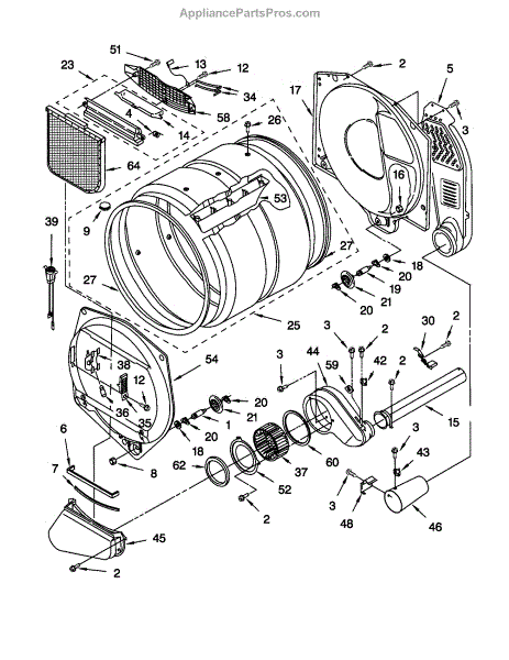 Blower housing assembly that directs airflow from the drum to the exhaust vent. Replace if cracked, damaged, or causing excessive noise in your dryer.
