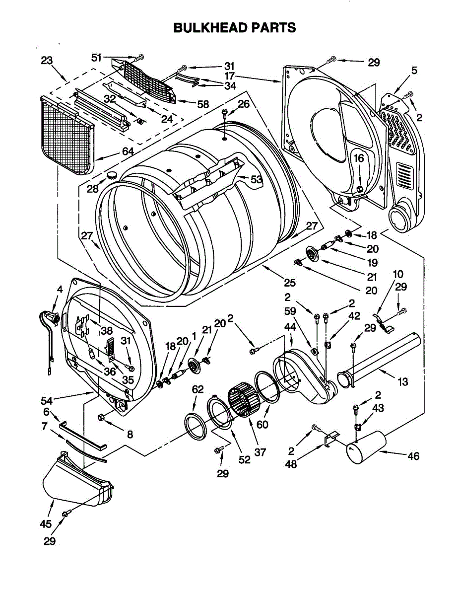 Replacement dryer drum front bulkhead panel. Installs at the front of the drum assembly. Needed when cracked, warped, or damaged from wear.