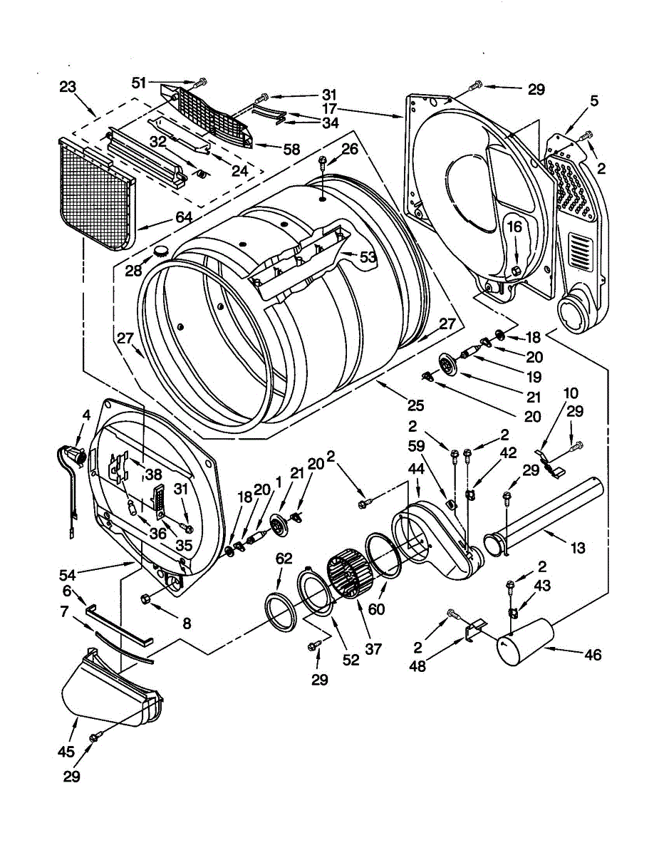 Blower housing assembly that directs airflow from the drum to the exhaust vent. Replace if cracked, damaged, or causing excessive noise in your dryer.