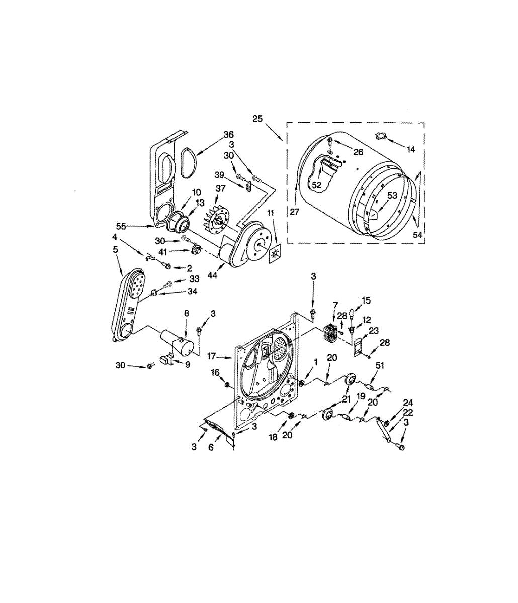 Structural rear panel that forms the back wall of your dryer drum compartment and aids heat retention. Replace if cracked, damaged, or causing noise.