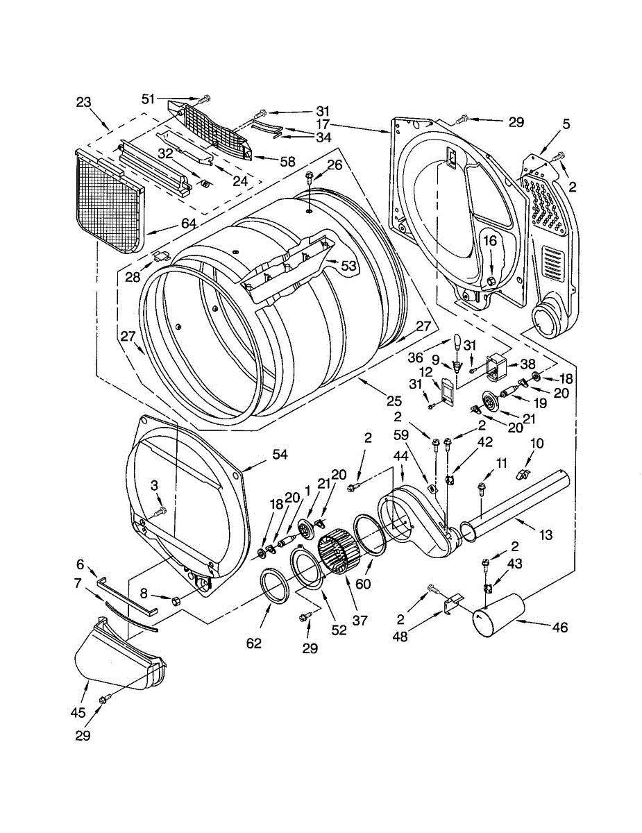 Blower housing assembly that directs airflow from the drum to the exhaust vent. Replace if cracked, damaged, or causing excessive noise in your dryer.