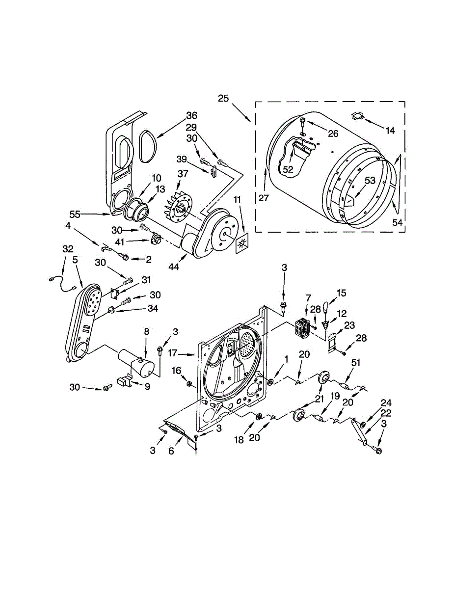 Structural rear panel that forms the back wall of your dryer drum compartment and aids heat retention. Replace if cracked, damaged, or causing noise.
