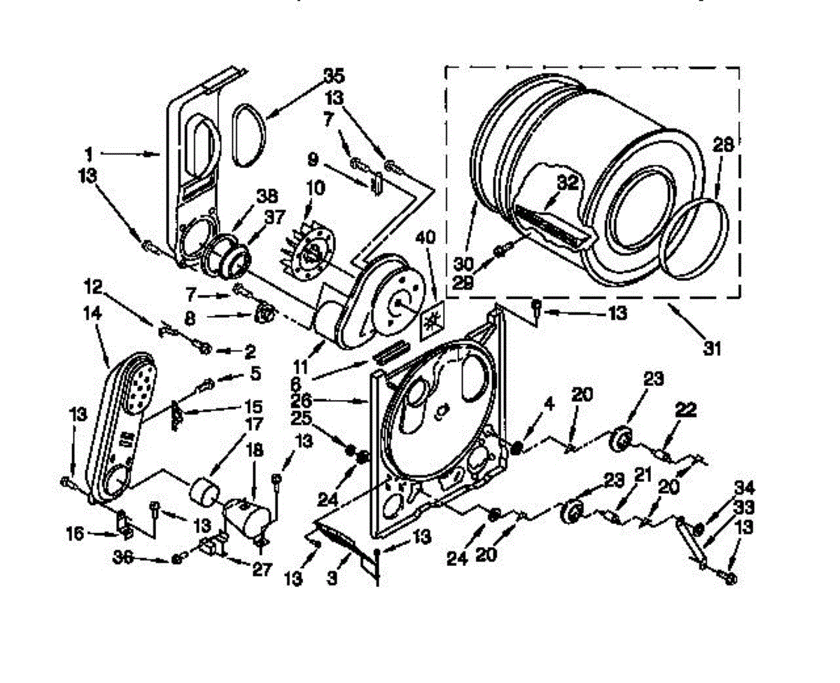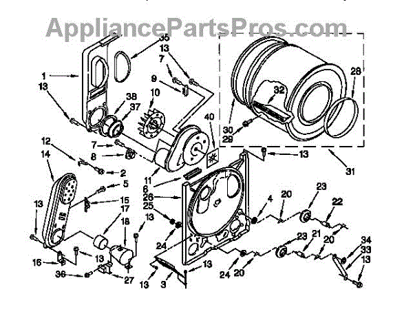 Complete drum assembly for dryers. Houses and rotates laundry during cycles. Replace if cracked, warped, damaged, or worn from extended use.
