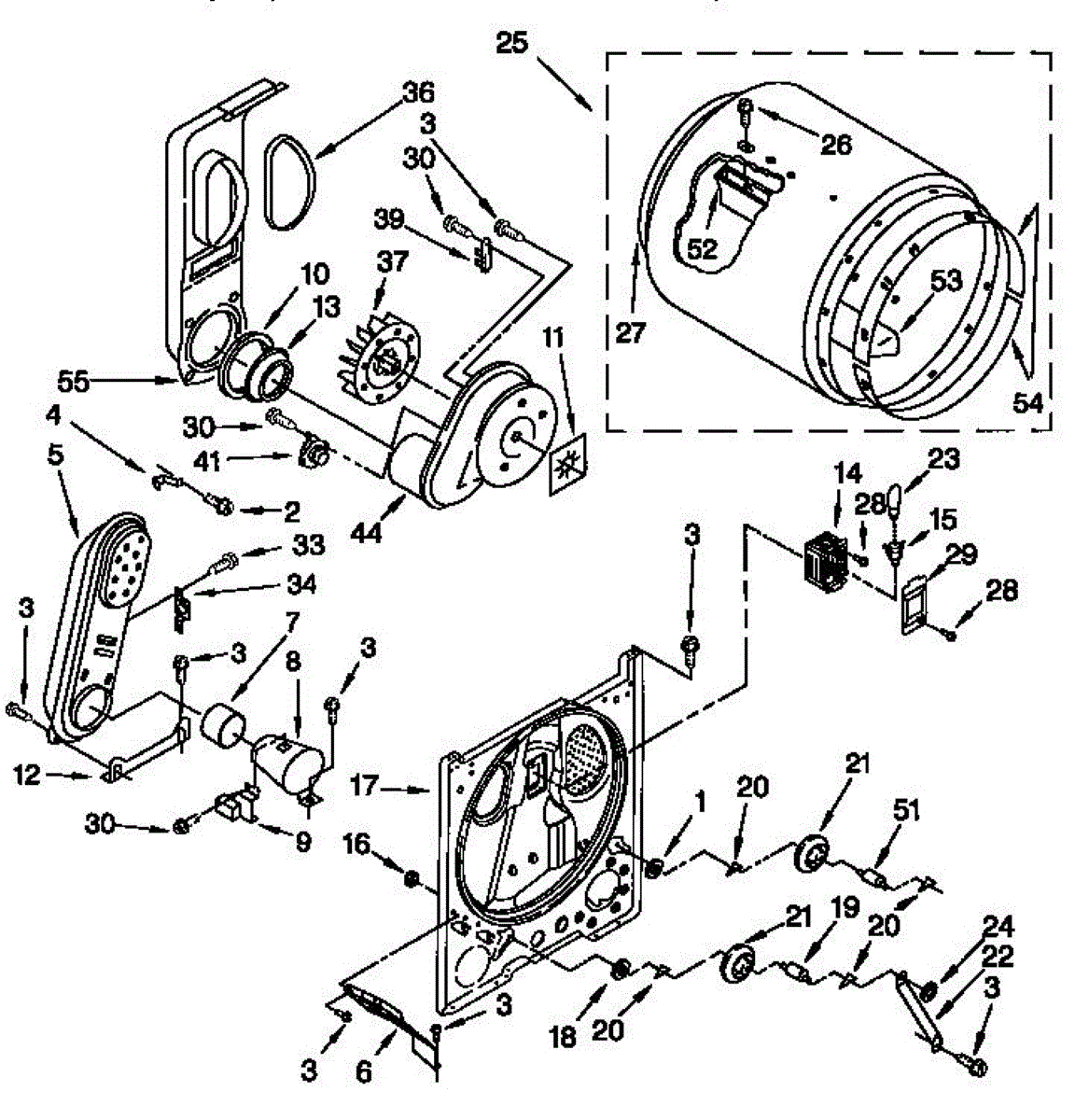 Structural rear panel that forms the back wall of your dryer drum compartment and aids heat retention. Replace if cracked, damaged, or causing noise.