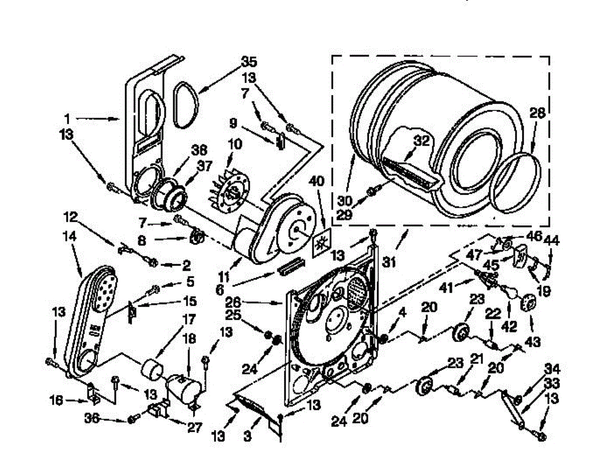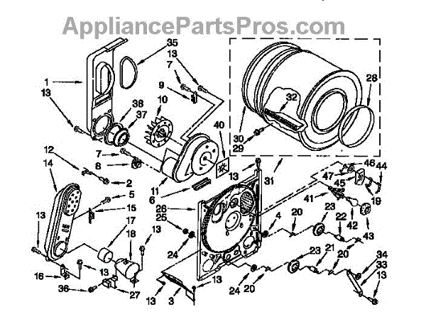 Complete drum assembly for dryers. Houses and rotates laundry during cycles. Replace if cracked, warped, damaged, or worn from extended use.