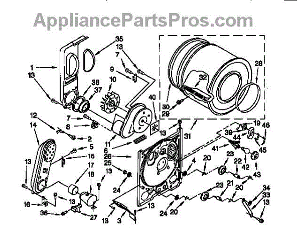 Complete drum assembly for dryers. Houses and rotates laundry during cycles. Replace if cracked, warped, damaged, or worn from extended use.