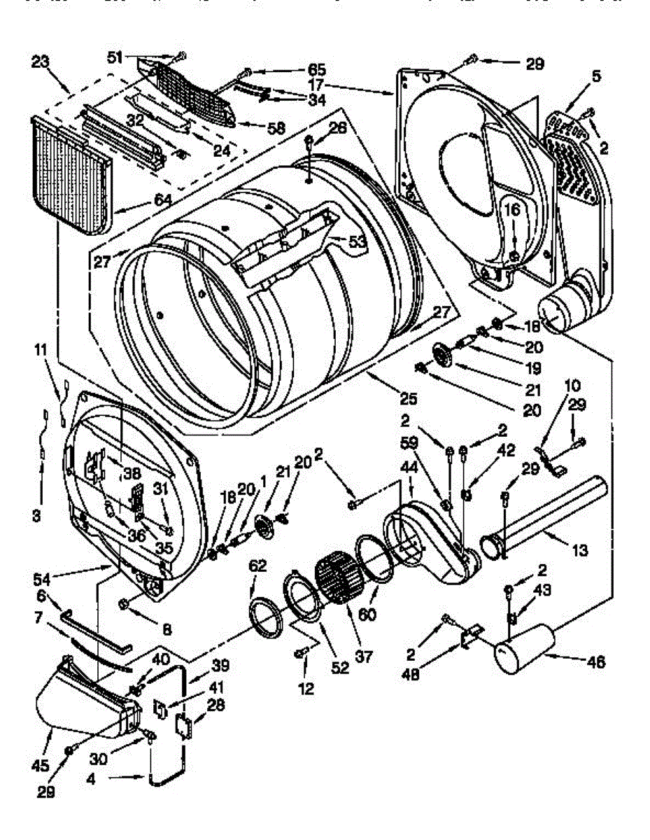 Blower housing assembly that directs airflow from the drum to the exhaust vent. Replace if cracked, damaged, or causing excessive noise in your dryer.