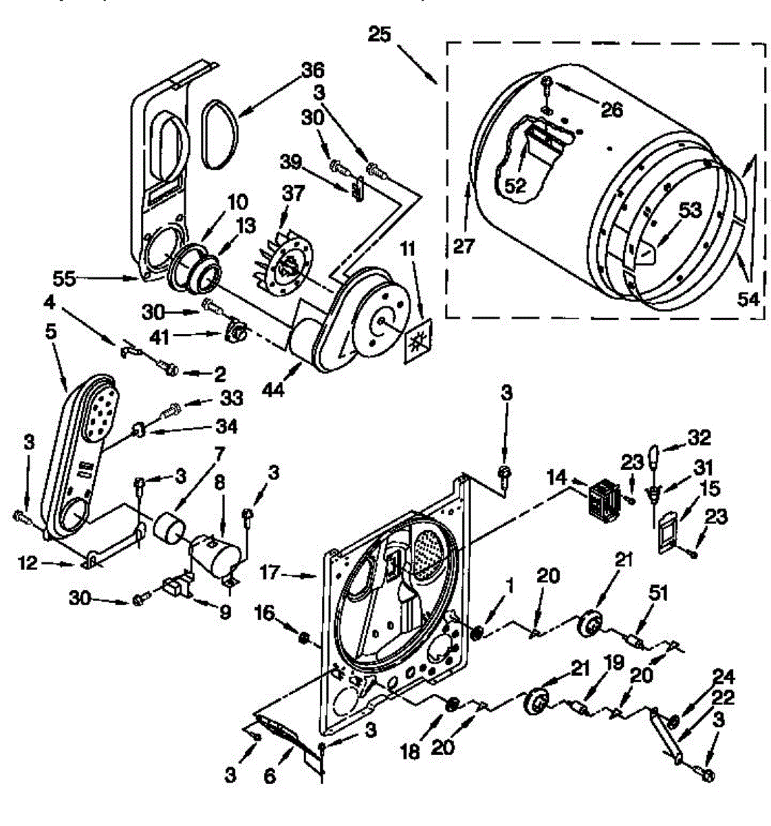 Structural rear panel that forms the back wall of your dryer drum compartment and aids heat retention. Replace if cracked, damaged, or causing noise.