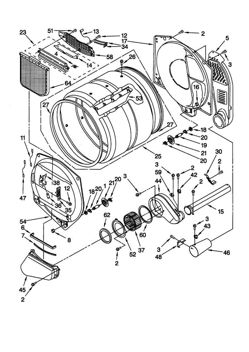 Blower housing assembly that directs airflow from the drum to the exhaust vent. Replace if cracked, damaged, or causing excessive noise in your dryer.