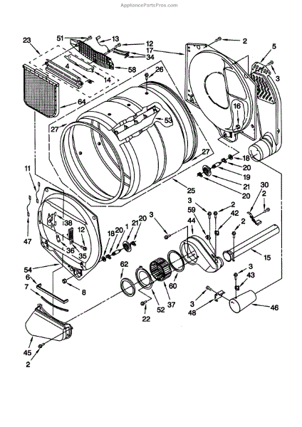Blower housing assembly that directs airflow from the drum to the exhaust vent. Replace if cracked, damaged, or causing excessive noise in your dryer.