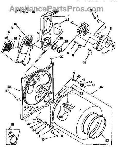 Replacement drum front bulkhead for dryers. Installs at the front of the drum assembly. Needed when original is cracked, damaged, or worn out.