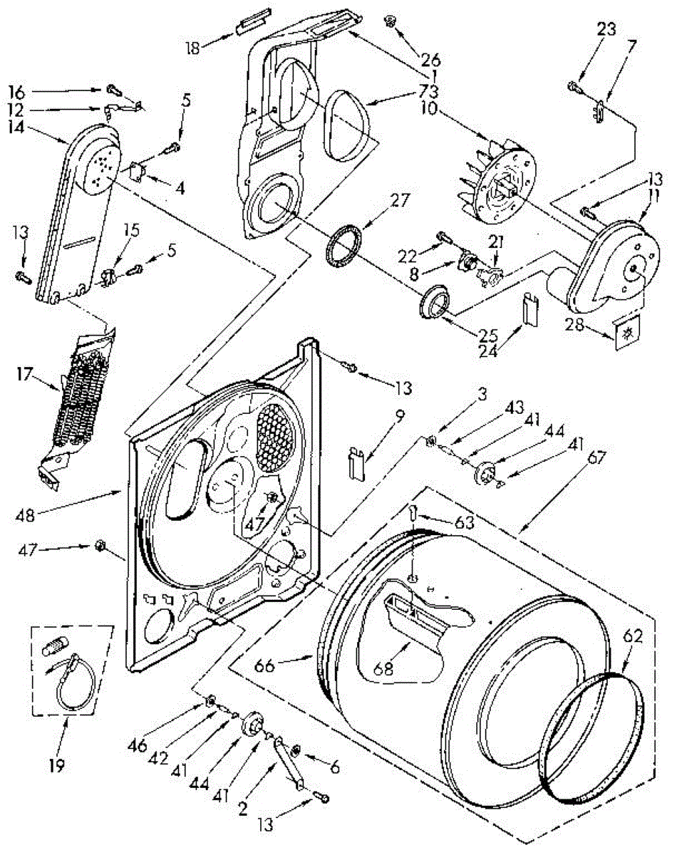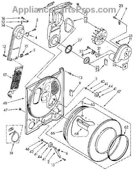 Replacement drum front bulkhead for dryers. Installs at the front of the drum assembly. Needed when original is cracked, damaged, or worn out.