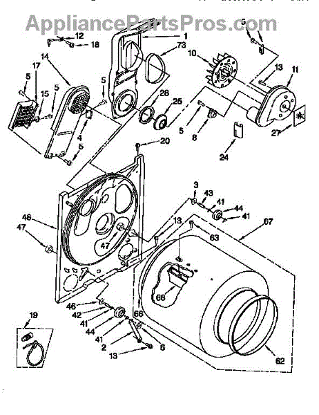 Replacement drum front bulkhead for dryers. Installs at the front of the drum assembly. Needed when original is cracked, damaged, or worn out.