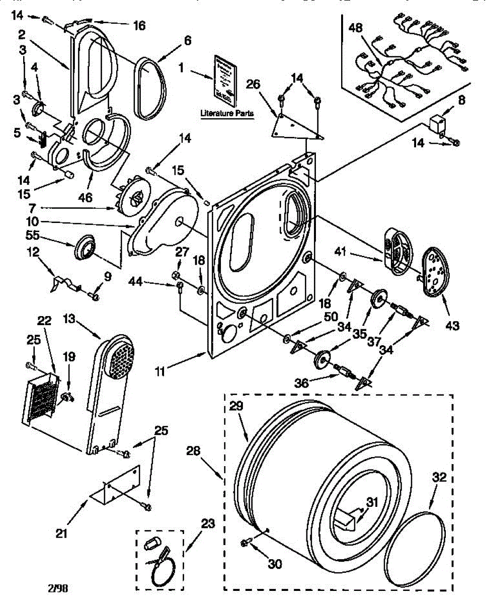 Factory protective shield panel for dryer assembly. Guards internal components and directs heat or airflow. Replace if cracked, broken, or missing.