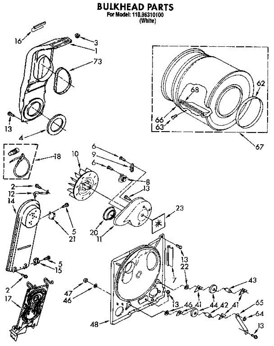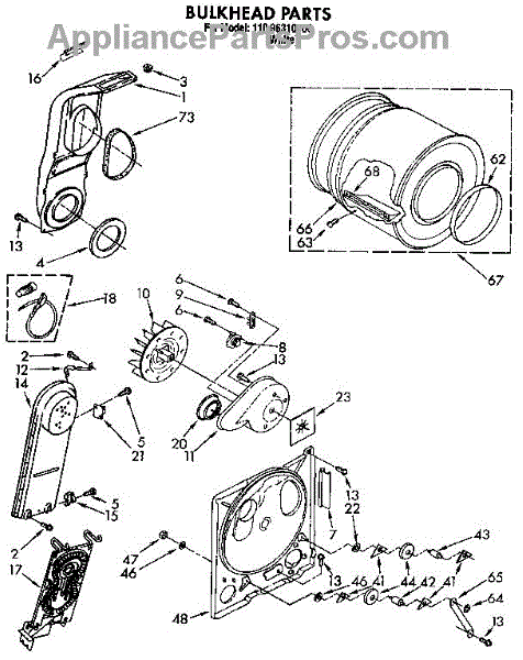 Replacement drum front bulkhead for dryers. Installs at the front of the drum assembly. Needed when original is cracked, damaged, or worn out.