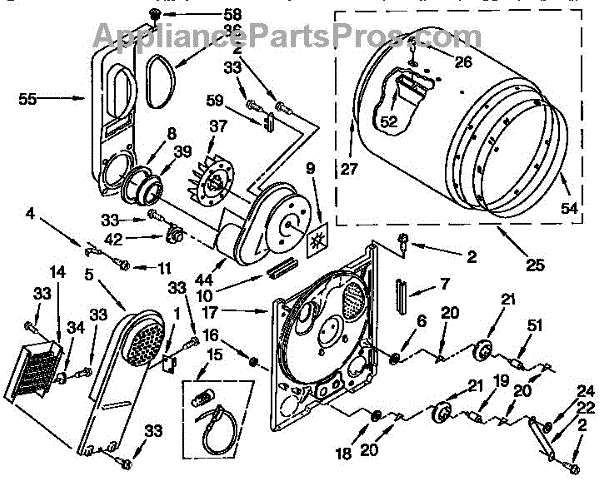 Complete drum assembly for dryers. Houses and rotates laundry during cycles. Replace if cracked, warped, damaged, or worn from extended use.