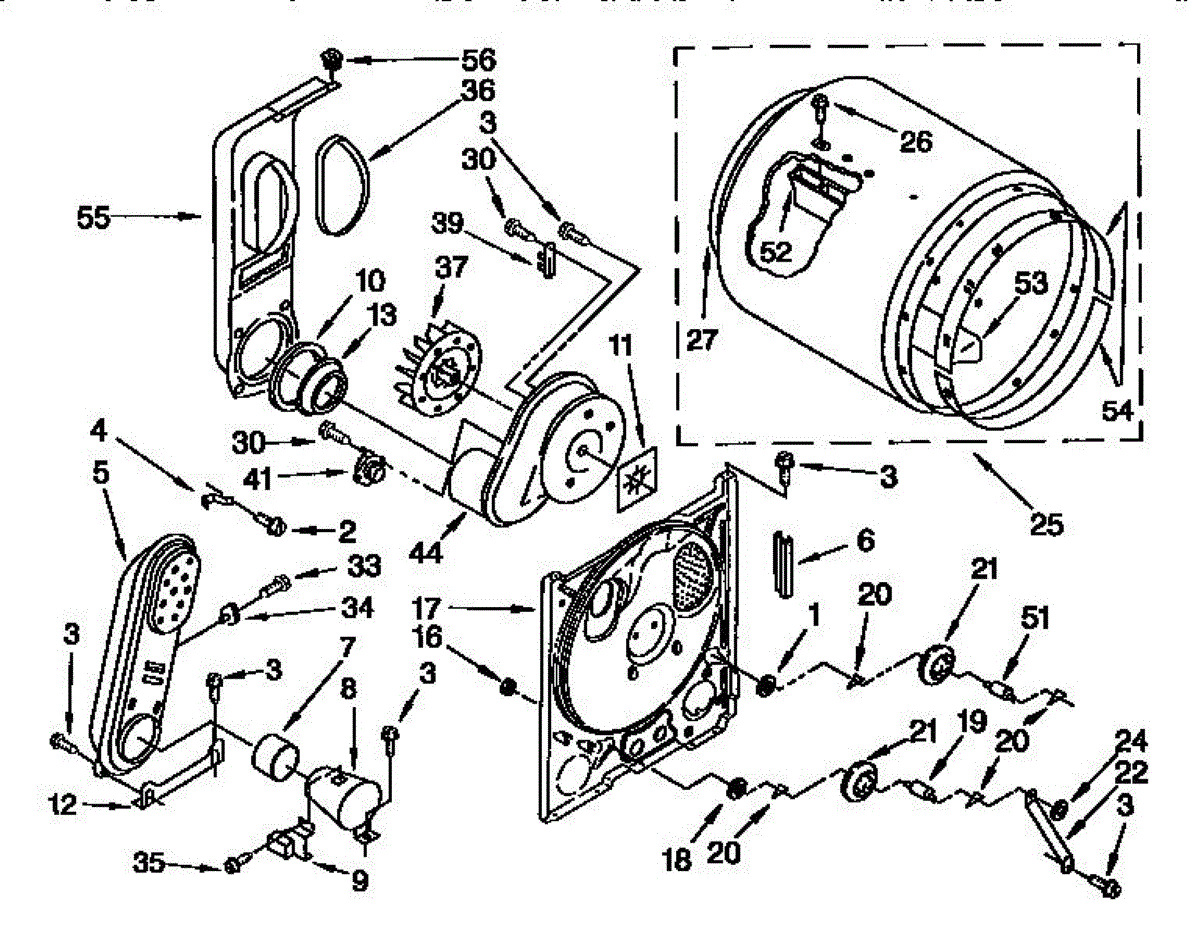 Rear drum support roller kit for dryers. Mounts behind the drum to maintain alignment and smooth rotation. Replace when rollers are worn or damaged.