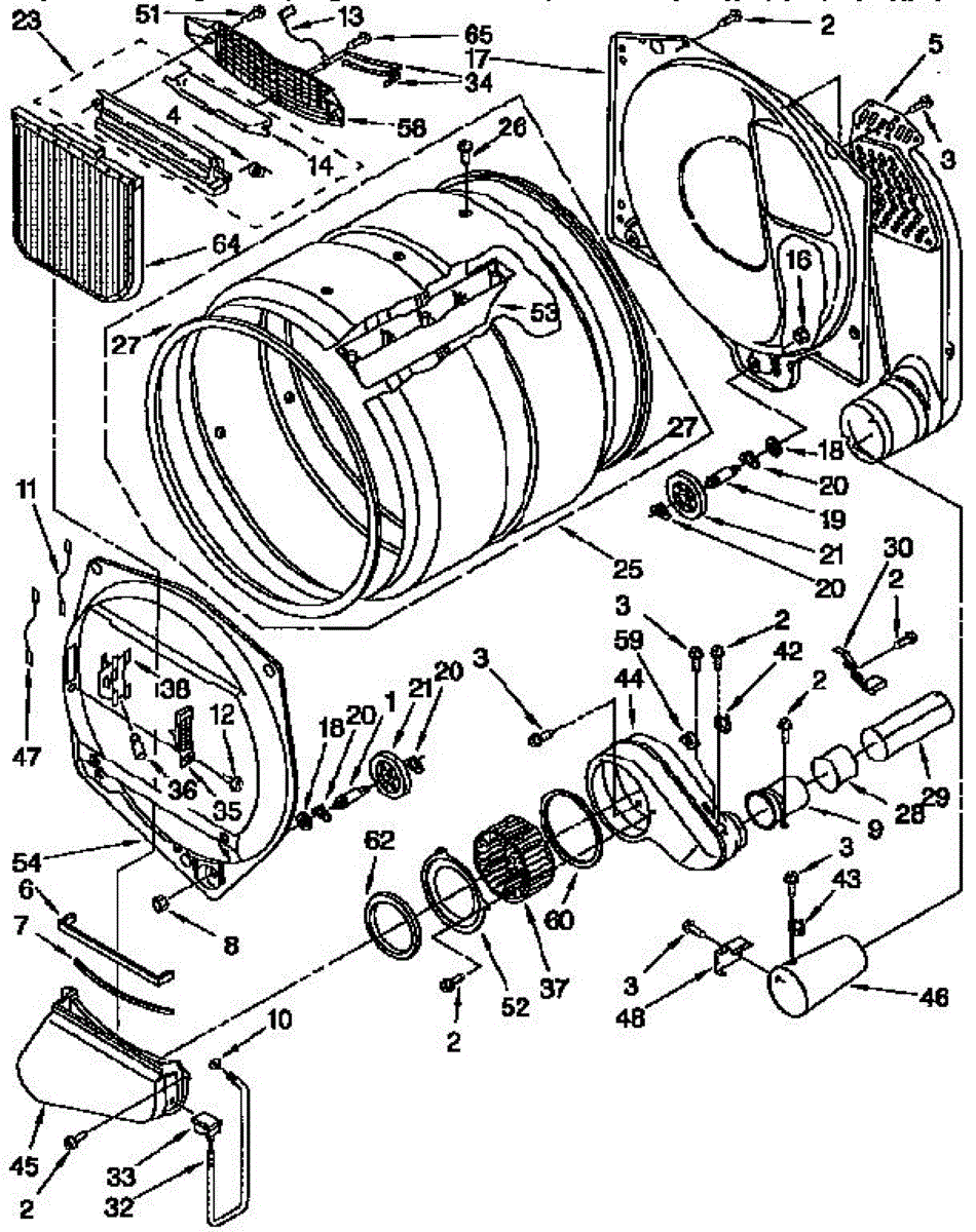 Blower housing assembly that directs airflow from the drum to the exhaust vent. Replace if cracked, damaged, or causing excessive noise in your dryer.