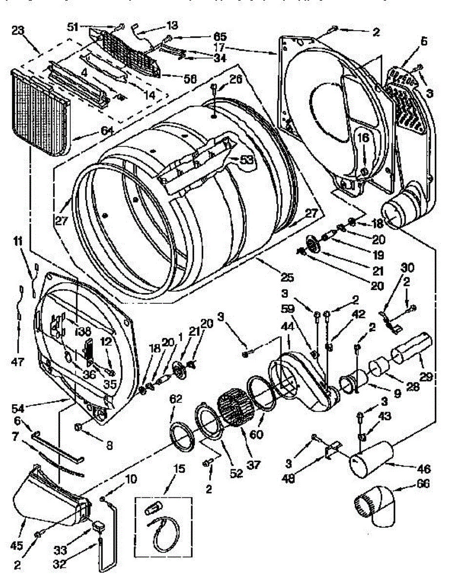 Blower housing assembly that directs airflow from the drum to the exhaust vent. Replace if cracked, damaged, or causing excessive noise in your dryer.