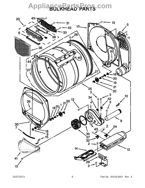 This front drum bulkhead is the stationary front panel that supports the dryer drum and seals the drum opening to maintain proper airflow and drum alignment for reliable drying performance. What it does: