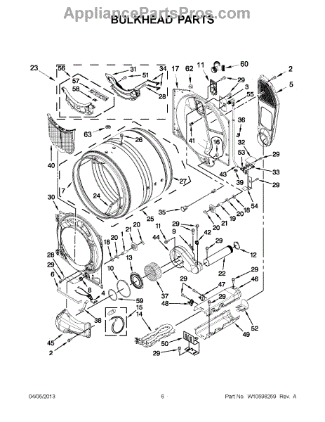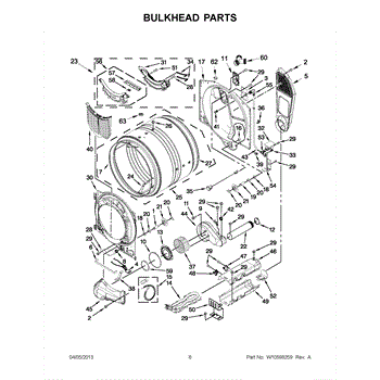 This bulkhead is the front structural panel that supports the dryer drum and seals the front of the cabinet to maintain proper airflow and drum alignment. Replacing a worn bulkhead restores stable drum rotation and prevents air leaks. What it does: