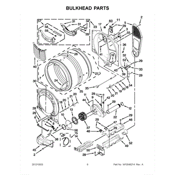 This bulkhead is the front structural panel that supports the dryer drum and seals the front of the cabinet to maintain proper airflow and drum alignment. Replacing a worn bulkhead restores stable drum rotation and prevents air leaks. What it does: