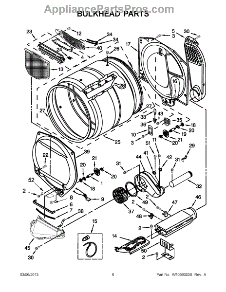 This front drum bulkhead is the stationary front panel that supports the dryer drum and seals the drum opening to maintain proper airflow and drum alignment for reliable drying performance. What it does: