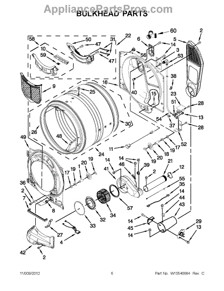 This bulkhead is the front structural panel that supports the dryer drum and seals the front of the cabinet to maintain proper airflow and drum alignment. Replacing a worn bulkhead restores stable drum rotation and prevents air leaks. What it does: