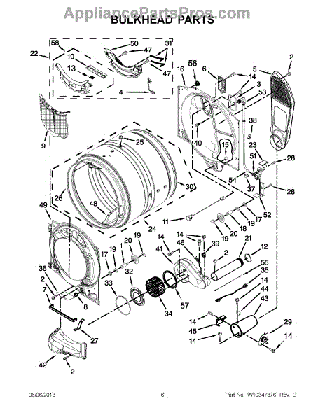 This bulkhead is the front structural panel that supports the dryer drum and seals the front of the cabinet to maintain proper airflow and drum alignment. Replacing a worn bulkhead restores stable drum rotation and prevents air leaks. What it does: