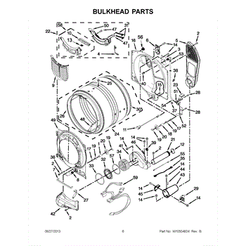 This bulkhead is the front structural panel that supports the dryer drum and seals the front of the cabinet to maintain proper airflow and drum alignment. Replacing a worn bulkhead restores stable drum rotation and prevents air leaks. What it does: