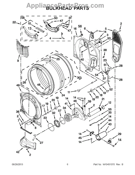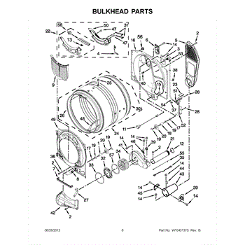 This bulkhead is the front structural panel that supports the dryer drum and seals the front of the cabinet to maintain proper airflow and drum alignment. Replacing a worn bulkhead restores stable drum rotation and prevents air leaks. What it does:
