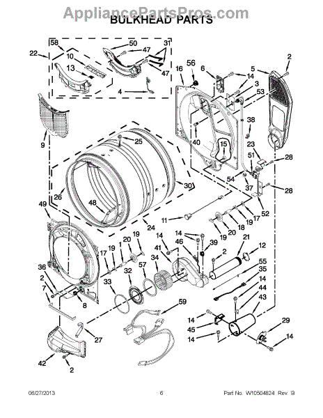 This bulkhead is the front structural panel that supports the dryer drum and seals the front of the cabinet to maintain proper airflow and drum alignment. Replacing a worn bulkhead restores stable drum rotation and prevents air leaks. What it does: