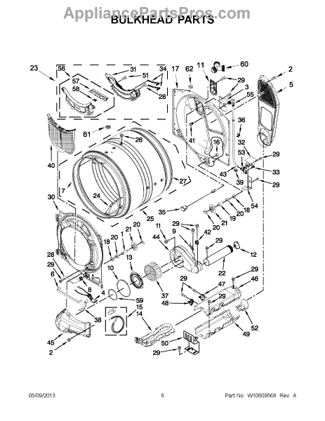 This bulkhead is the front structural panel that supports the dryer drum and seals the front of the cabinet to maintain proper airflow and drum alignment. Replacing a worn bulkhead restores stable drum rotation and prevents air leaks. What it does: