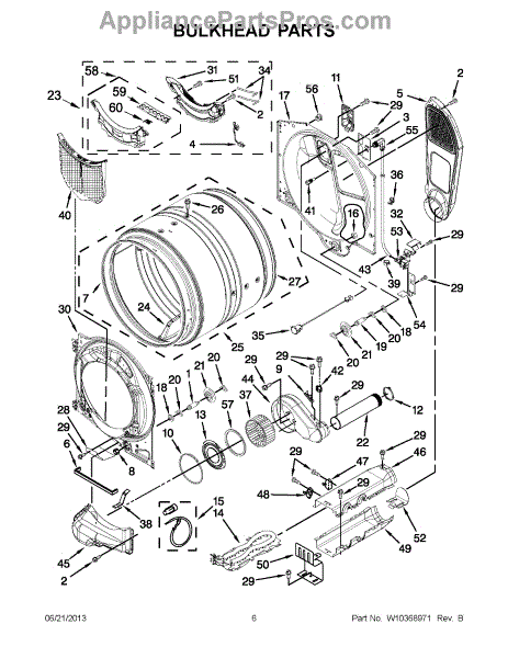 This bulkhead is the front structural panel that supports the dryer drum and seals the front of the cabinet to maintain proper airflow and drum alignment. Replacing a worn bulkhead restores stable drum rotation and prevents air leaks. What it does: