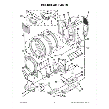 This bulkhead is the front structural panel that supports the dryer drum and seals the front of the cabinet to maintain proper airflow and drum alignment. Replacing a worn bulkhead restores stable drum rotation and prevents air leaks. What it does: