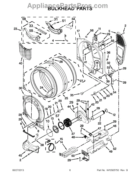 This bulkhead is the front structural panel that supports the dryer drum and seals the front of the cabinet to maintain proper airflow and drum alignment. Replacing a worn bulkhead restores stable drum rotation and prevents air leaks. What it does: