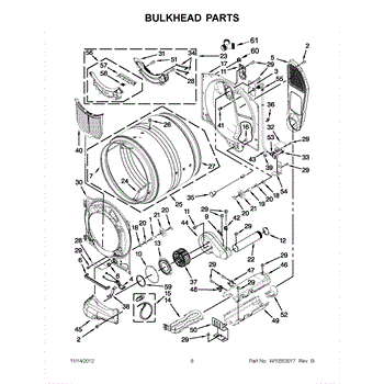 This bulkhead is the front structural panel that supports the dryer drum and seals the front of the cabinet to maintain proper airflow and drum alignment. Replacing a worn bulkhead restores stable drum rotation and prevents air leaks. What it does:
