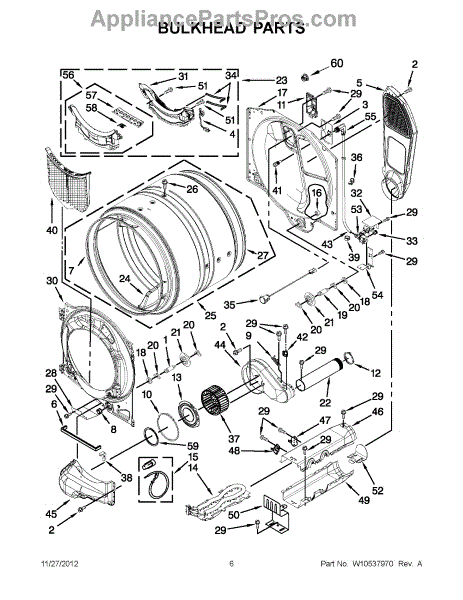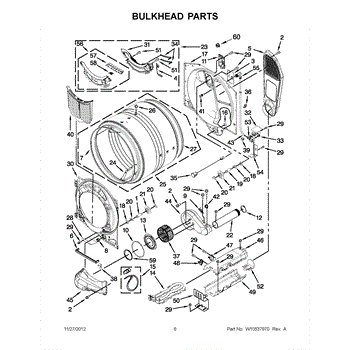 This bulkhead is the front structural panel that supports the dryer drum and seals the front of the cabinet to maintain proper airflow and drum alignment. Replacing a worn bulkhead restores stable drum rotation and prevents air leaks. What it does:
