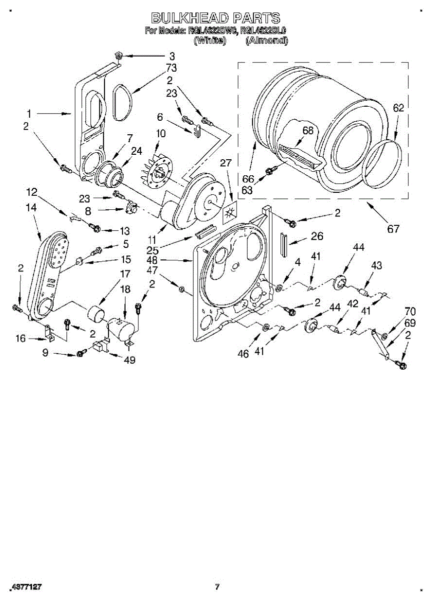 Replacement drum front bulkhead for dryers. Installs at the front of the drum assembly. Needed when original is cracked, damaged, or worn out.