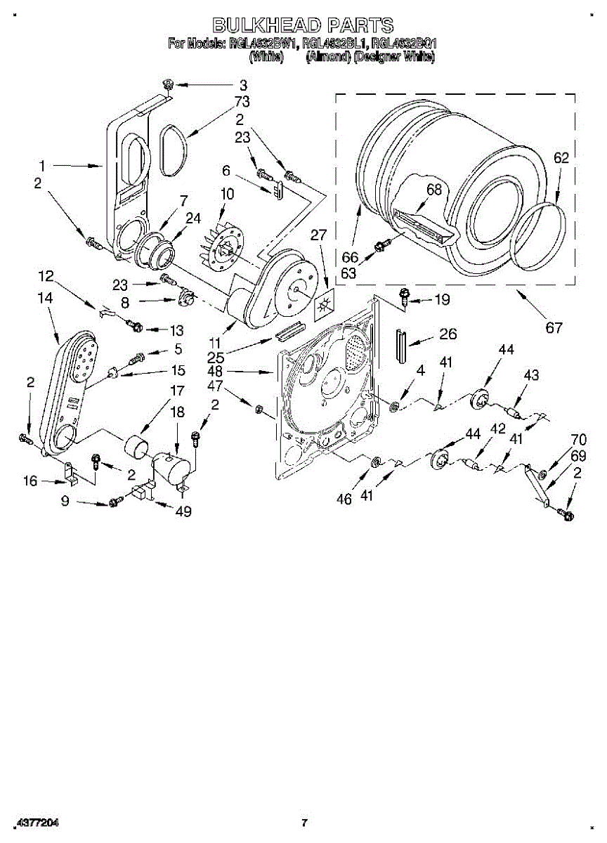 Replacement drum front bulkhead for dryers. Installs at the front of the drum assembly. Needed when original is cracked, damaged, or worn out.