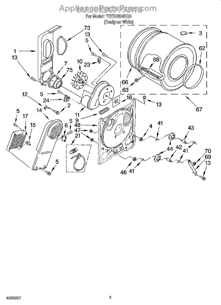 This is a drum assembly intended for use with dryers. This part can be found inside the dryer and is responsible for holding clothing while a cycle is running. It holds wet laundry while loading the appliance. Over time and with use, the drum assembly can start to wear out. This can cause the dryer to squeal, start and stop during a cycle, make buzzing noises, or seize up.If the drum assembly is damaged, it will need to be replaced. Make sure to have basic tools and a pair of work gloves ready. The dryer should be turned off and unplugged from the wall. Raise the top panel, remove the front panel, and then remove the drum. The drum support roller should be taken out and installed on the new drum. Reinstall with the new component and reassemble all parts before use.The drum assembly is made to be used with dryers and washer/dryer combos from Inglis, Estate, Admiral, Crosley, Roper, Magic Chef, Amana, KitchenAid, Maytag, Kenmore, and Whirlpool. It is a genuine OEM replacement part that is sourced directly from the manufacturer. The part is sold on an individual basis.