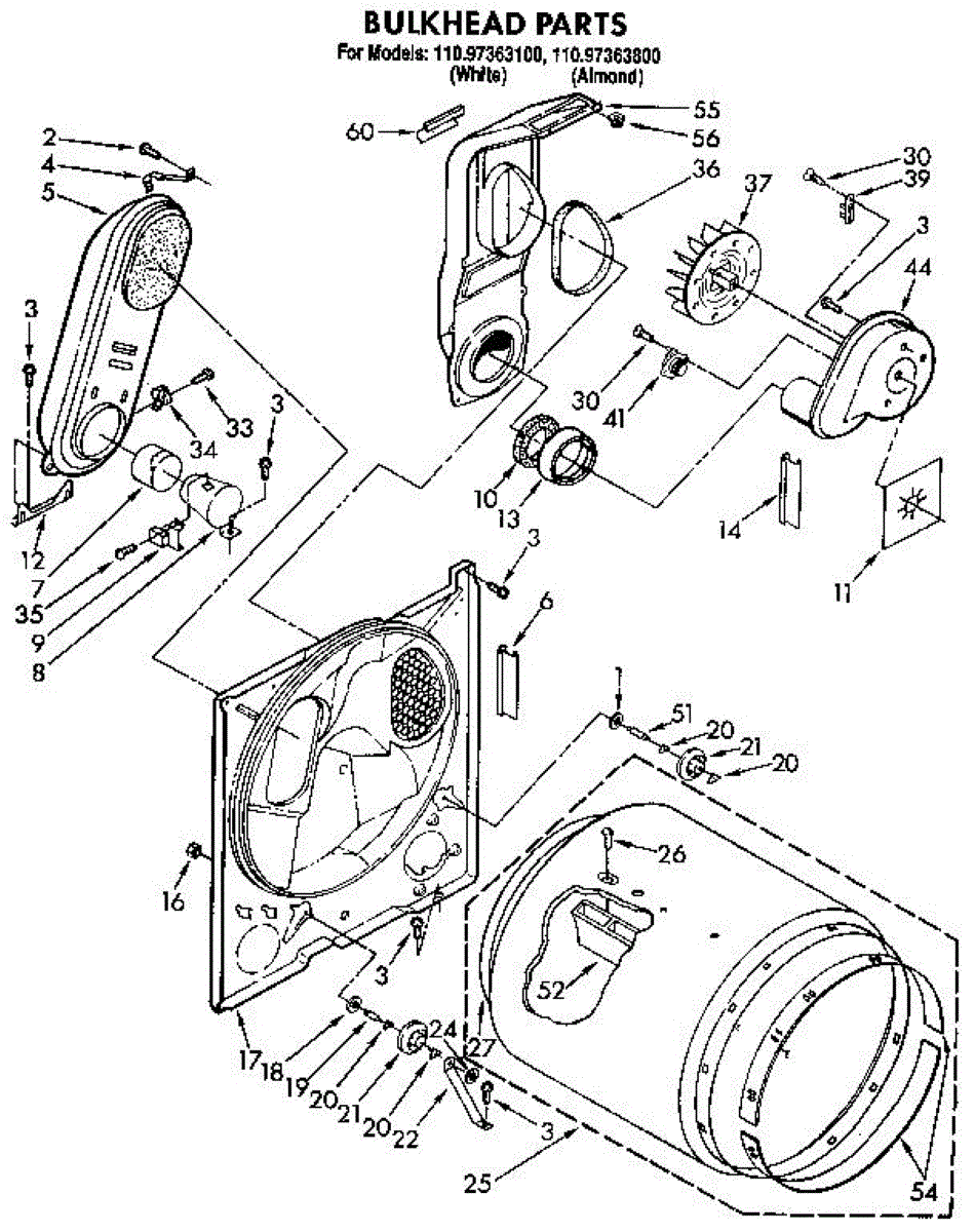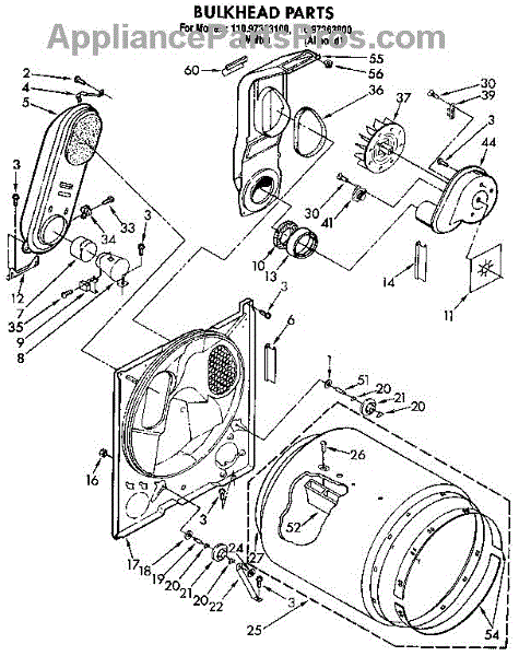 Replacement drum front bulkhead for dryers. Installs at the front of the drum assembly. Needed when original is cracked, damaged, or worn out.
