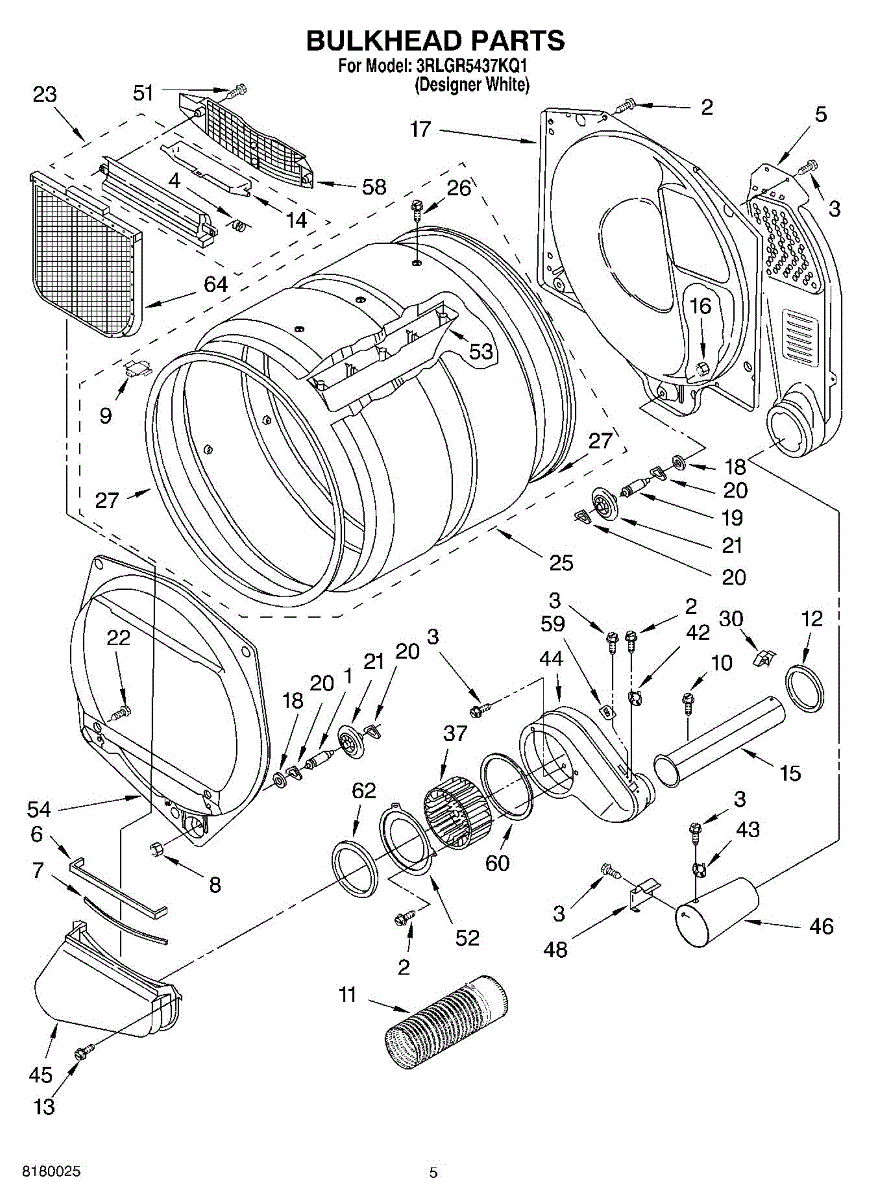 This front drum bulkhead is the stationary front panel that supports the dryer drum and seals the drum opening to maintain proper airflow and drum alignment for reliable drying performance. What it does: