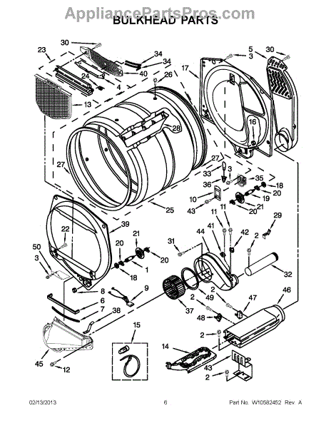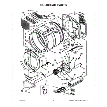 This front drum bulkhead is the stationary front panel that supports the dryer drum and seals the drum opening to maintain proper airflow and drum alignment for reliable drying performance. What it does: