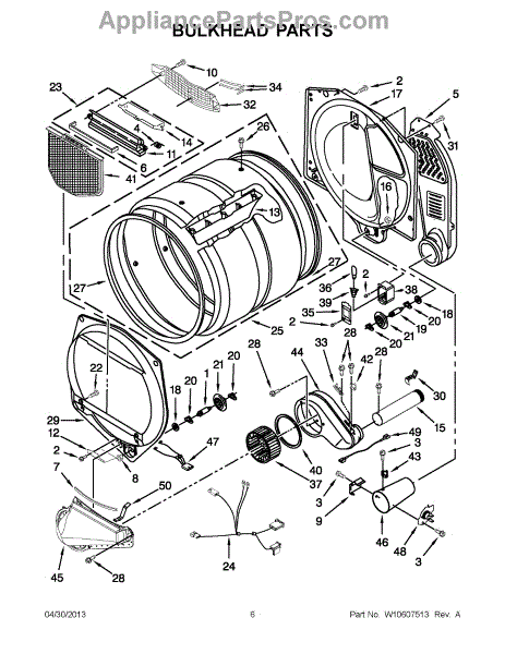 This front drum bulkhead is the stationary front panel that supports the dryer drum and seals the drum opening to maintain proper airflow and drum alignment for reliable drying performance. What it does: