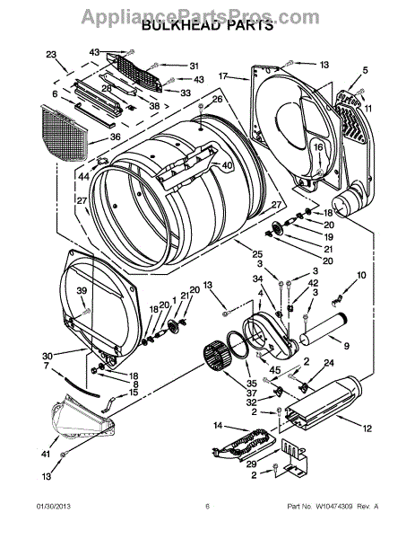 This bulkhead is the front interior panel that supports the drum and helps direct dryer airflow for efficient tumbling and exhaust. It restores proper drum alignment and airflow when the original panel is worn or damaged. What it does: