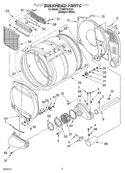 This front drum bulkhead is the stationary front panel that supports the dryer drum and seals the drum opening to maintain proper airflow and drum alignment for reliable drying performance. What it does: