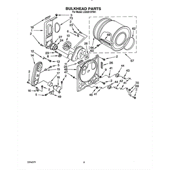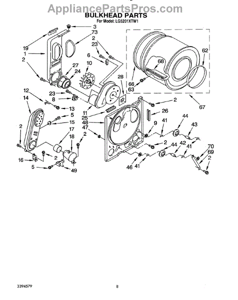 Replacement drum front bulkhead for dryers. Installs at the front of the drum assembly. Needed when original is cracked, damaged, or worn out.