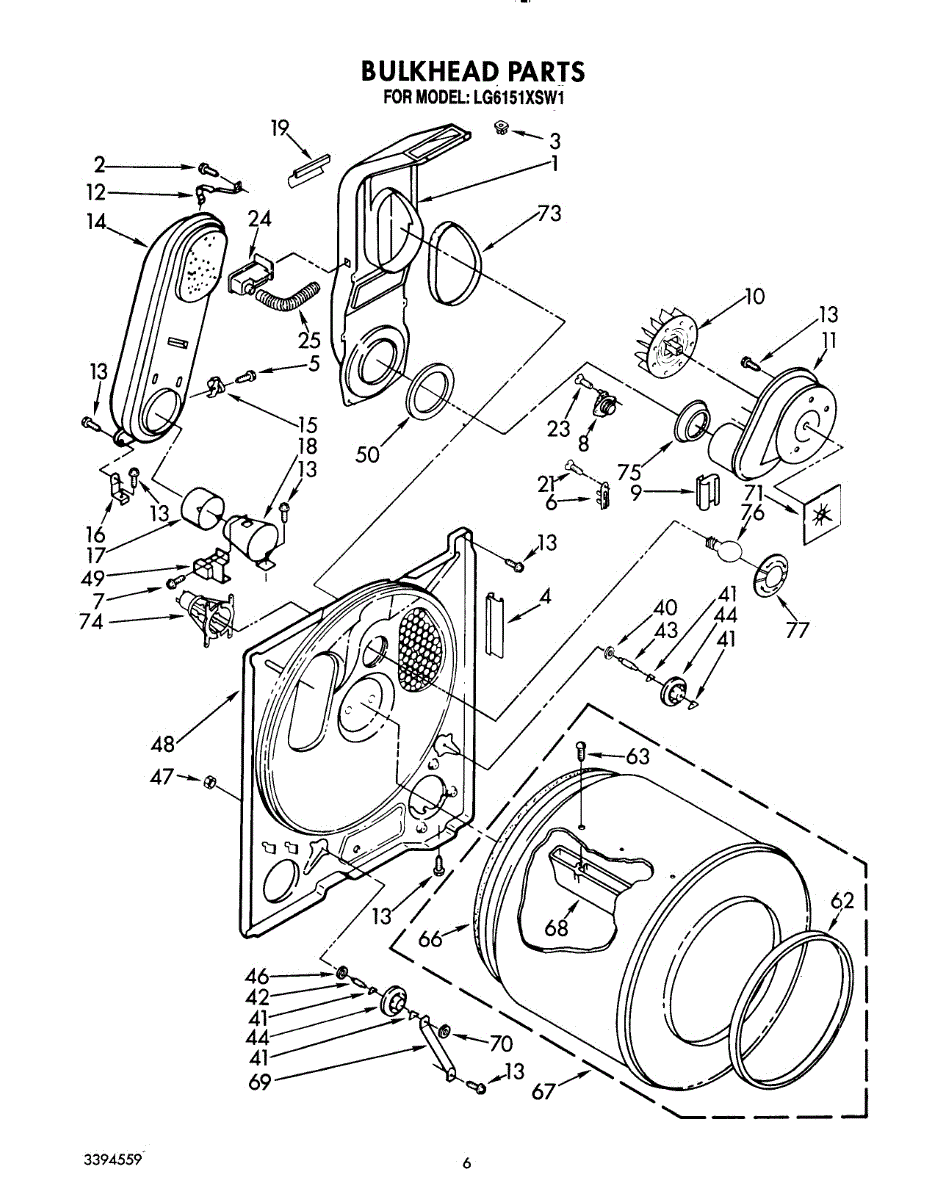 Replacement drum front bulkhead for dryers. Installs at the front of the drum assembly. Needed when original is cracked, damaged, or worn out.