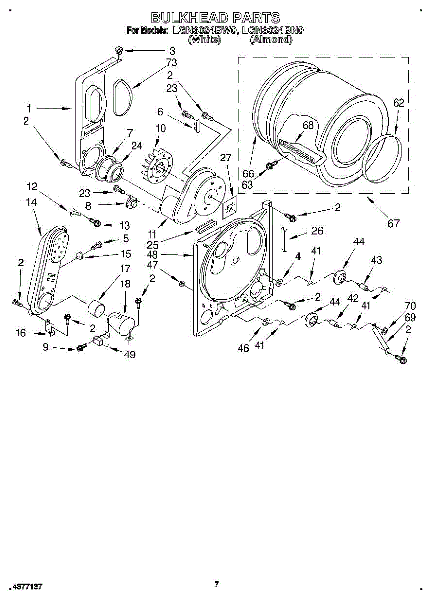 Replacement drum front bulkhead for dryers. Installs at the front of the drum assembly. Needed when original is cracked, damaged, or worn out.